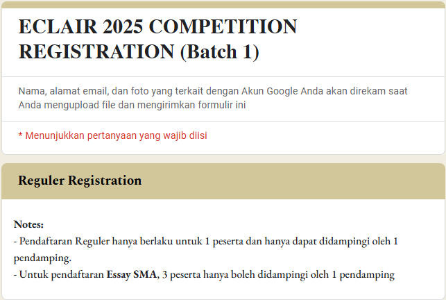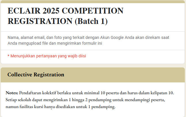 bagi pendaftar kolektif, panitia akan mengrimkan file excel untuk mengisi nama peserta dan lomba yang akan diikuti. file excel tersebut dikirim melalui g-form yang tersediabagi pendaftar reguler, setelah memilih jenjang sekolah bisa langsung mengisi lomba yang akan diikuti