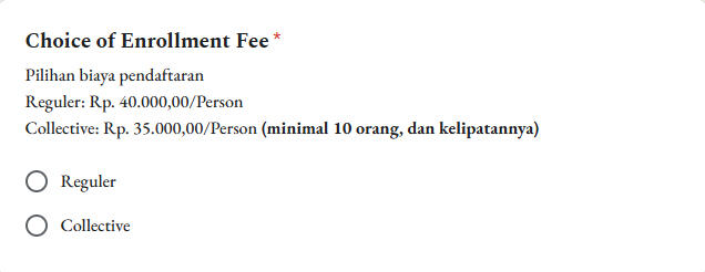 Bagi pendaftar kolektif wajib mendaftarkan 10 peserta (atau kelipatan 10) agar mendapat potongan harga